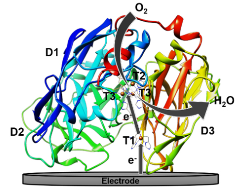 图1 漆酶的蛋白分子结构及其直接电催化氧气还原的机理