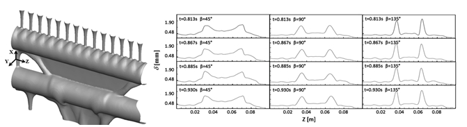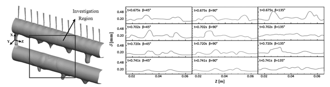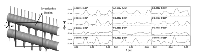 为此,能源与动力研究中心的研究人员建立了适于逆向气流下的水平管外降膜流动三维瞬态数值模型。该模型可准确预测多排水平管间液体流型转变特性及其影响因素,分析不同流型下水平管外液膜厚度沿管周向和轴向不同的分布规律(见图1,2,3),并通过自建的水平管外降膜流动特性研究实验台对模型精度进行验证。在此基础上,开展了高湿烟气水平管外降膜吸收过程的传热传质耦合机理研究;首次构建了具有预报能力的适于湿烟气吸收的水平管外降膜吸收机理模型;利用研制的具有液相内部温度场测量手段的高湿烟气水平管外降膜吸收实验台进行模型验证和修正,获得了高湿烟气下水平管外降膜吸收过程中气液两相局部瞬态的流动、传热和传质耦合规律;提出了适于湿烟气水平管外降膜吸收器设计参数和操作条件的匹配选择方法以及优化方案。