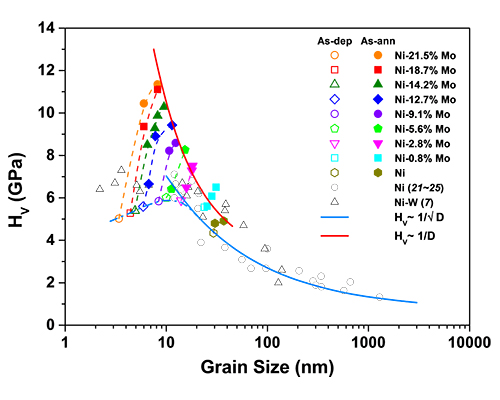 图:纳米晶体Ni-Mo合金的软化及硬化行为。制备态(空心)及退火态(实心)样品的显微硬度随晶粒尺寸的变化
