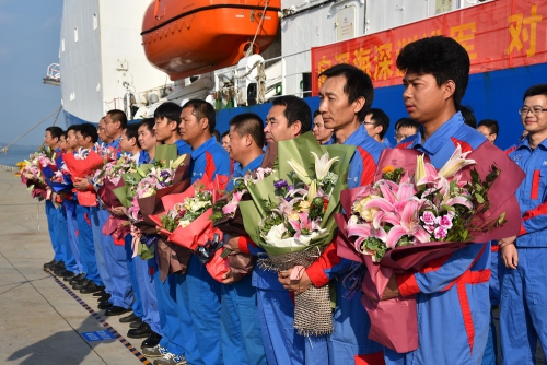23日上午8:30,中科院副院长丁仲礼,科技部、国家海洋局北海分局、海南省科技厅、三亚市等有关部门和单位领导、参航单位代表、科考队员家属代表在三亚港码头欢迎科考队凯旋。