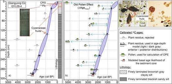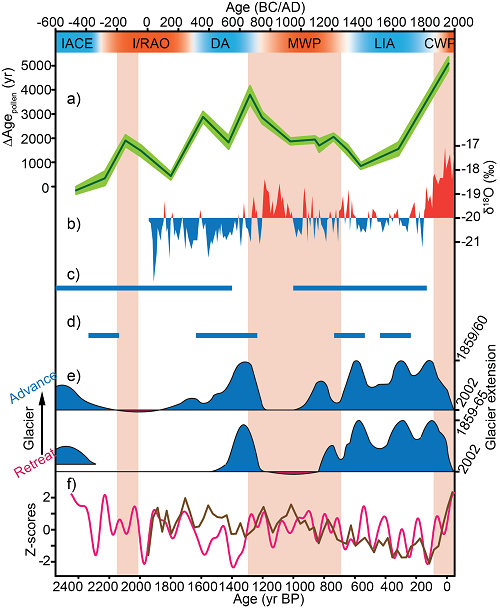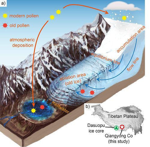 鉴于此,中国科学院青藏高原研究所、地球科学卓越创新中心研究员徐柏青及其博士后张继峰与来自北京大学等单位的合作者,对高原南部枪勇冰川冰前湖沉积物进行了多方法(植物残体、孢粉浓缩物、全有机质)放射性碳测年,提出了一个重建古冰川融化强度的新指标(“老孢粉效应”,即沉积物孢粉年龄与沉积物真实年龄的差值)。依据该研究提出的概念模型(图1),现代孢粉通过大气干湿沉降进入冰川积累区,并随着冰川流动逐渐变成老孢粉储存在消融区的老冰之中,冰川的加速融化会释放更多的老孢粉进入冰前湖。该研究重建了该地区2500年的冰川融化历史(图2),与达索普冰芯氧同位素记录以及青藏高原、欧洲的古冰川记录等具有较好的一致性(图3),说明北半球温度、西风环流活动可能是高原季风区冰川晚全新世百年尺度波动的主控因素。对比发现,近代的冰川融化强度达到过去2500年以来最强,超过了历史上的中世纪暖期和罗马暖期。