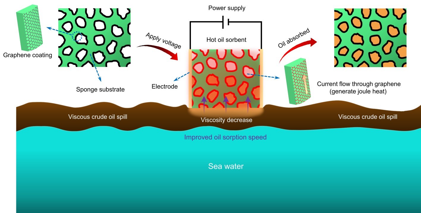 图一:焦耳热辅助石墨烯修饰的海绵快速吸附高粘度浮油示意图