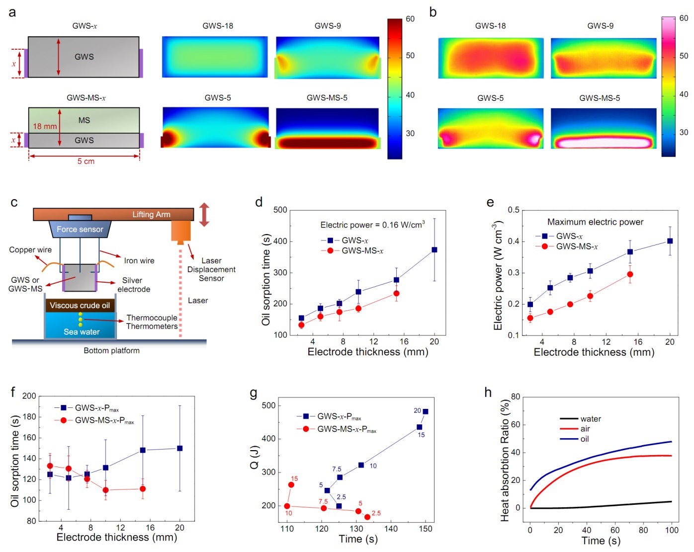 图三:石墨烯海绵温度分布场对电能利用效率的影响。a.具有不同电极结构(GWS-x)和石墨烯涂层(GWS-MS-x)的石墨烯修饰的海绵,在相同通电功率下的温度分布场模拟计算结果。b.与图a相对应的实验结果。c.石墨烯修饰的海绵吸油速度测试装置示意图。d.在相同输入电功率密度下,电极结构和石墨烯涂层的分布对石墨烯修饰的海绵吸油速度的影响。e.具有不同电极结构和石墨烯涂层的石墨烯修饰的海绵所能承受的最大通电功率。f.加热区域厚度调控。g.不同温度场的石墨烯修饰的海绵的吸油时间同输入电能的关系。h.石墨烯修饰的海绵(GWS-MS-10-Pmax)吸油过程中的热量传递模拟计算结果。