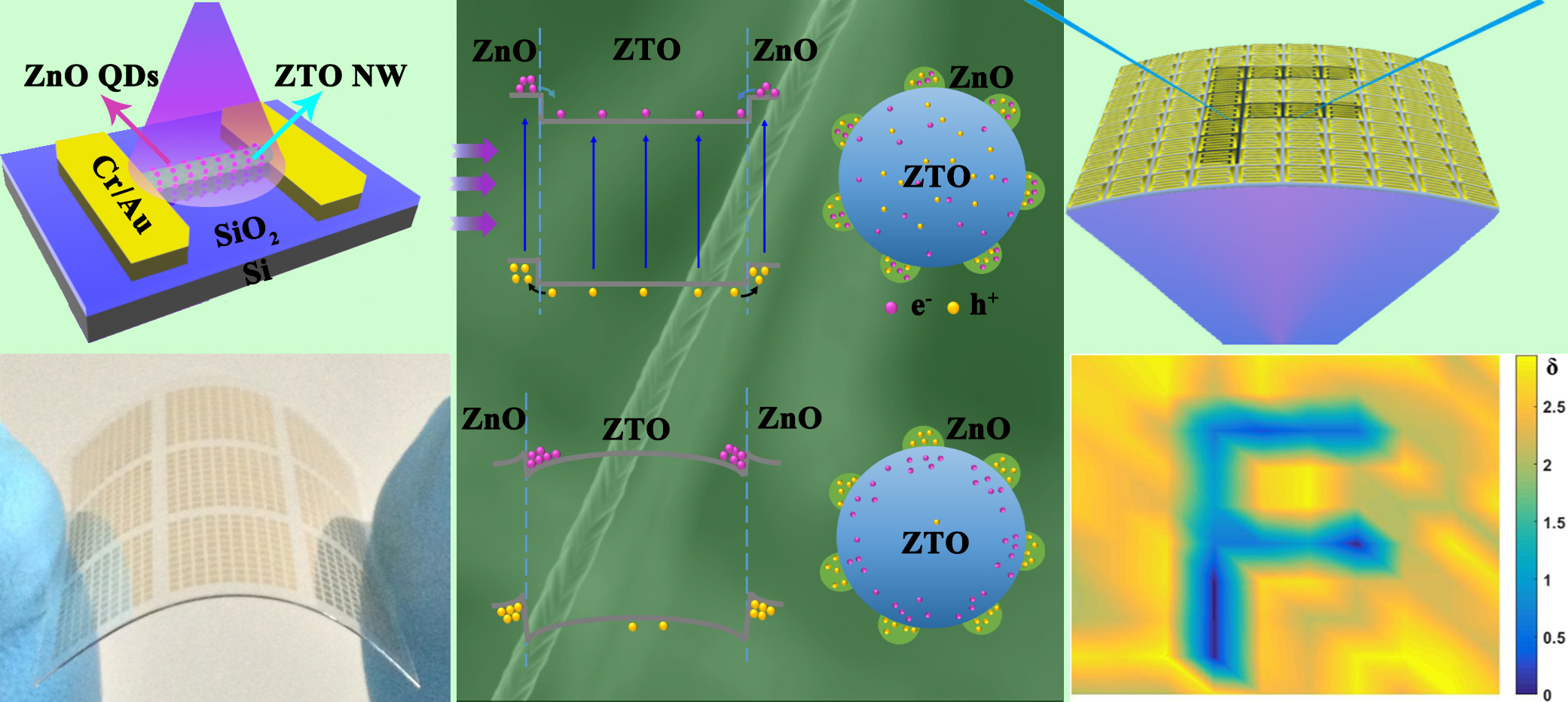 在此背景下,该团队中的博士生李禄东和助理研究员娄正采用在单晶Zn2SnO4纳米线表面修饰ZnO量子点的方法,成功研制出一种同时具备高光电导增益、低暗电流和快响应速度等特点的柔性紫外图像传感器。该器件制作在柔性PET薄膜衬底上,具有优异的可弯曲性和机械稳定性。由于Zn2SnO4纳米线和ZnO量子点之间形成了II型异质结,使得其光电导增益高达1.1 × 107,比探测率为9.0 × 1017 Jones,响应时间仅为47 ms。此外他们还进行了理论模拟,结果与实验数据相吻合。在弯曲条件下,所研制的柔性紫外图像传感器能够有效地对紫外图像进行感应并重现,证明了其在高性能柔性紫外成像方面的潜在应用。该项工作为获得高性能柔性紫外图像传感器提供了一个新的设计思路和可行性工艺。经过进一步的研究和改进,有望实现更高的像素集成度并为高性能柔性紫外成像在实际生产和生活中的应用带来可能。