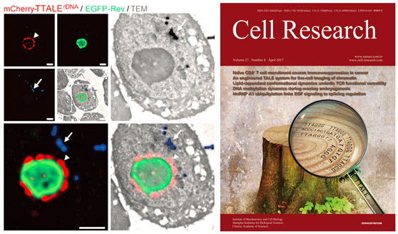 TTALE介导的28S核糖体DNA在细胞核仁区的精准成像(左);Cell Research封面(右)