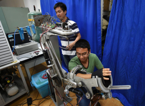 沈阳自动化所科研人员在测试一款研制阶段的医疗手术机器人(2015年7月30日摄)。新华社记者 姚剑锋 摄