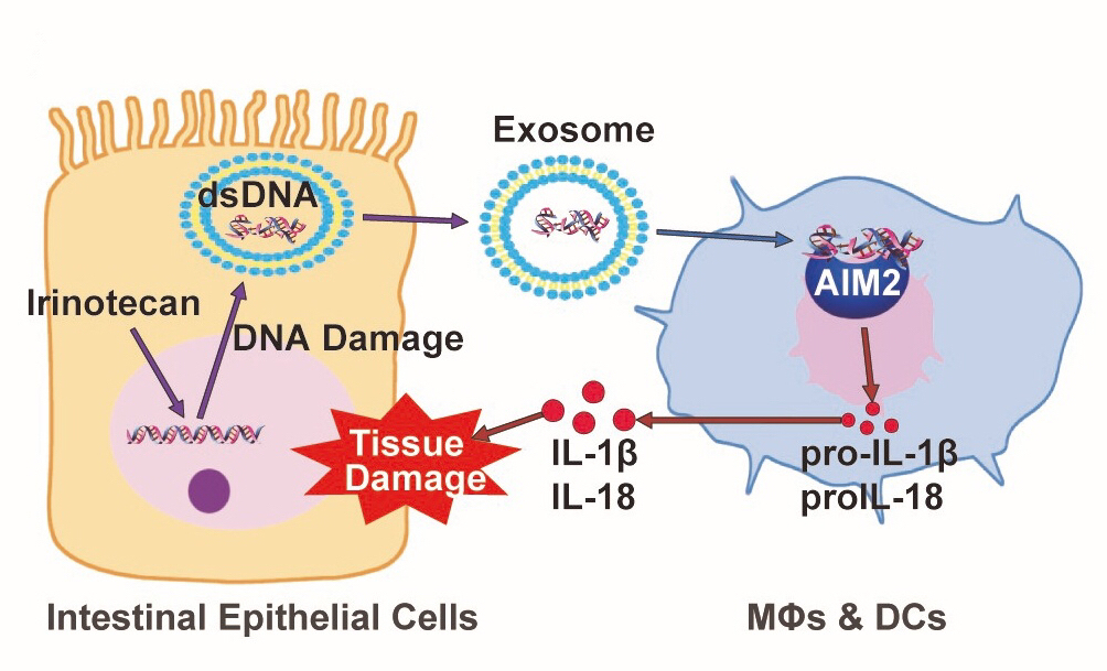 针对上述问题,上海药物所肿瘤药理团队在大力推进自主新药研发的同时,与中科院上海生命科学研究院研究员孙兵课题组合作,开展了喜树碱类药物的毒性机制研究,旨在为喜树碱类药物的个性化治疗提供依据。研究发现喜树碱类药物能引起肠道上皮细胞释放双链DNA(dsDNA),后者被外泌体携带(exosome)进入微环境的固有免疫细胞,激活AIM2介导的炎症小体反应,导致肠道局部炎性损伤,是喜树碱类药物所致腹泻的核心机制。基于该机制,研究采用临床样本证实dsDNA是喜树碱类药物的毒性标志物。该研究首次揭示喜树碱毒性机制,发现喜树碱类药物的毒性标志物和缓解毒性发生的联合用药方案,为临床规避毒性发生,增加临床获益提供理论依据,也为细胞毒类药物的个性化治疗提供重要的理论依据。