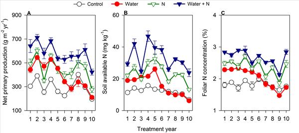中国科学院沈阳应用生态研究所方运霆和姜勇两个团队与中国科学院植物研究所韩兴国团队等合作,通过在中科院多伦恢复生态学实验站内蒙古典型草原进行十年的水分和氮素添加控制实验,发现在实验处理前六年,降雨增加显著提高植物生产力、土壤可利用氮和叶片氮含量。但是,在接下来的四年,降雨增加不再提高植物生产力以及土壤和植物氮含量。然而在水氮同时添加的处理中,植物生产力持续增加,土壤可利用氮和叶片氮含量也持续增加(图1)。该研究结果表明在长期的降水增多后,氮供给限制了水分对植物生产力的促进作用,也表明过去的模型高估了降水对草地生态系统生产力和碳吸存的作用。通过对植物和土壤、土壤铵态氮和硝态氮的稳定同位素自然丰度的进一步研究,发现实验后期降雨增加导致氮损失增多,其中反硝化作用很可能是氮损失的重要途径,从而加剧了氮供给对植物生长的限制(图2)。这些结果表明草地生态系统对长期降雨增加的响应格局受土壤氮可利用性的调节,长期降雨增加会导致半干旱地区从水氮共同限制转变为氮独立限制,也表明气候变化将诱导生态系统资源限制类型发生改变。