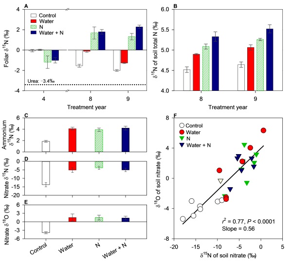 图2.水分和氮添加对内蒙古典型草地植物和土壤稳定同位素特征的影响。处理八年后,水分添加、氮添加或水分氮同时添加处理都增加植物、土壤、土壤铵态氮和铵态氮15N自然丰度,说明这些处理加速了的土壤氮循环和氮损失。土壤硝酸盐18O和15N自然丰度的相关性能说明反硝化作用(气态氮损失主要途径)的发生,因为反硝化作用发生会导致剩余没有被利用的硝酸盐18O和15N自然丰度按0.5到1的比例增加(本研究的比例是0.56)。