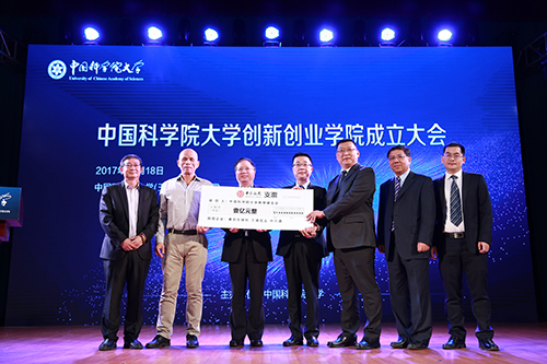 成立大会上,赛伯乐投资集团董事长朱敏、三盛宏业投资集团董事长陈建铭、中兴通集团董事长朱元涛对国科大创新创业学院进行了联合捐赠并发表致辞,三家企业共同捐赠1亿元人民币,支持学院的建设和发展。国科大创新创业学院院长董纪昌,副院长洪湧、胡毅、陈佳接受了捐赠。