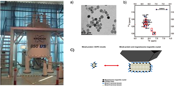 趋磁Mms6蛋白与磁小体晶体相互作用。a).磁小体晶体电镜图;b).Mms6与磁小体晶体相互作用核磁光谱;c).Mms6与磁小体晶体相互作用模式图