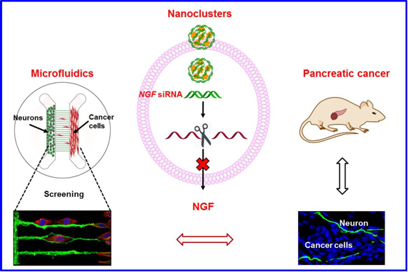 前期的研究表明,靶向神经递质受体是可以有效抑制肿瘤的,但仍不是一种理想的安全有效的调控肿瘤微环境的方法。最近,该研究组将胰腺癌(号称“癌症之王”,5年生存率<5%)作为研究对象,将小干扰RNA(siRNA)靶向胰腺癌肿瘤组织高表达的神经生长因子(NGF)作为治疗手段,开发了一种基于金纳米簇(直径小于3nm)的NGF siRNA的递送平台,通过NGF基因的沉默来调控胰腺肿瘤的神经微环境和肿瘤发展。相对于传统药物载体材料而言,该金纳米簇由于其独特的超小尺寸效应和表面正电荷,具有常规材料前所未有的高载药量,可以为siRNA提供有效保护,延长siRNA在体内的循环时间,提高siRNA在肿瘤部位的靶向聚集。通过皮下肿瘤、原位肿瘤以及病人来源(PDX)三种胰腺癌小鼠模型的活体成像、组织切片分析等实验验证,证明金纳米簇携带的siNGF可以有效沉默胰腺癌组织中的NGF基因,从而有效抑制胰腺癌的发生和发展,为胰腺癌的诊疗开辟了一种全新的手段。该研究还将促进纳米微流控芯片在药物筛选、芯片上的器官、临床检测等方面的应用。
