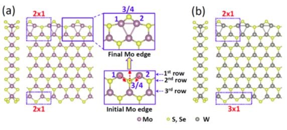图1. (a) MoX2和(b) WX2锯齿型纳米条带边缘重构示意图。中间插图以Mo边为例展示了普适的(2×1)重构的自钝化过程。