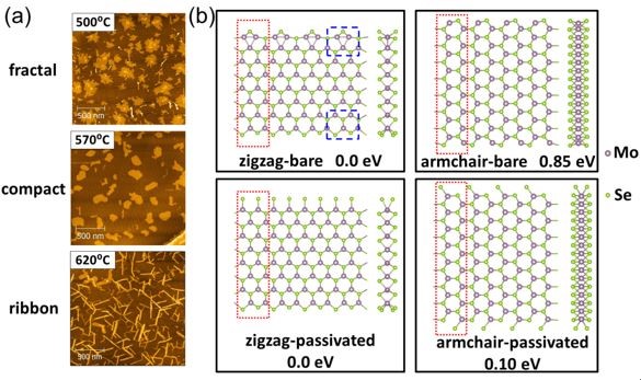 图2. (a)不同生长温度下MoSe2形貌的原子力显微镜(AFM)图像;(b)第一性原理计算比较不同MoSe2纳米条带的结构与能量:上图中重构的锯齿型边缘能量明显低于扶手椅型边缘能量;下图中两者能量相近。