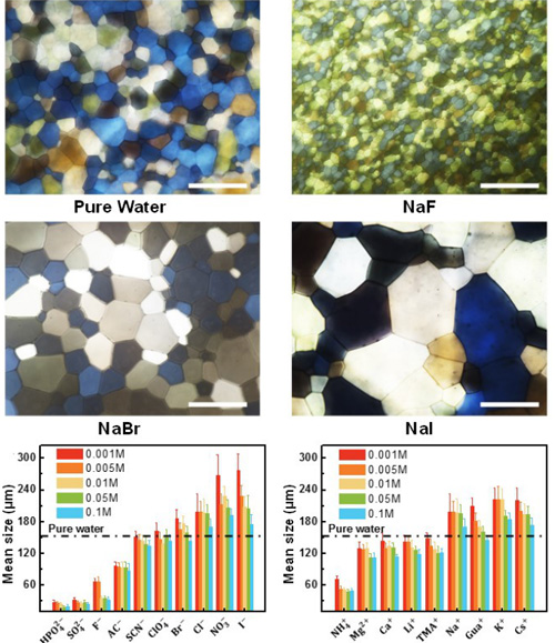 冰重结晶是一种奥斯瓦尔德熟化现象(冰晶演化过程中,因为大冰晶的表面能比小冰晶的表面能小,导致大冰晶变大而小冰晶变小甚至消失),这一现象广泛存在于自然界。冰重结晶在诸多方面有着至关重要的影响,例如:食物储存、极寒地区生物的生存、细胞和器官的低温冷冻保存、冰川运动,洋流变迁以及大气臭氧的含量等。因此研究冰晶重结晶机制,实现对冰重结晶过程的调控就具有极其重要的价值。最近,他们与美国内布拉斯加大学林肯分校教授Zeng Xiaocheng合作,研究了离子对冰晶重结晶的影响。他们发现水溶液中的离子类型对重结晶后的冰晶畴尺寸有非常大的影响:当水溶液中有氟离子时,重结晶后冰晶畴小;水溶液中有碘离子时,重结晶后冰晶畴就大;通过采用不同离子使冰晶畴尺寸能在20微米至280微米范围内连续可调(图1)。