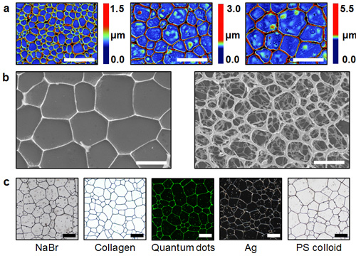 由于冰晶畴尺寸在大范围内可调,而冰重结晶是动力学稳定态过程,所以冰重结晶为冰模板法可控制备两维和三维多孔材料提供了新的方法。图3显示以重结晶后的冰晶为模板,将高分子、量子点和高分子胶体粒子组装成孔径可调的2D和3D材料。该工作发表在《自然—通讯》上(Nat. Commun., 2017, 8, 15154.)。