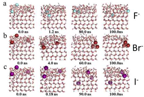 进一步分子动力学模拟发现不同离子在冰晶和水中的分配系数不同:氟离子倾向于留在水中,而碘离子能被包裹在冰晶里(图2)。在重结晶过程中,冰水界面会有大量的氟离子存在而抑制冰晶生长;相反,由于冰晶中包含了碘离子使冰晶更易生长,从而导致了不同离子水溶液重结晶后冰晶畴尺寸截然不同。这样研究人员通过重结晶的实验方法结合理论模拟,揭示了离子在冰水中的分配系数和导致不同重结晶结果的分子机制。