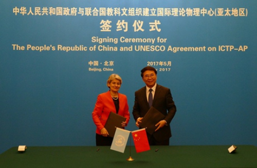 5月13日下午,中国科学院与联合国教科文组织(UNESCO)关于在中国科学院大学(简称“国科大”)建立UNESCO二类机构——国际理论物理中心(亚太地区)(ICTP-AP)的签约仪式在北京钓鱼台国宾馆举行。中科院院长白春礼和UNESCO总干事博科娃(Irina Bokova)分别代表中华人民共和国政府和UNESCO签署协议。