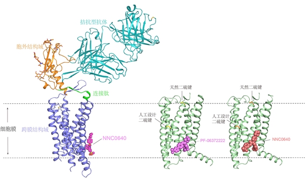 GCGR全长蛋白与抗体及小分子别构调节剂复合物晶体结构(左)和GLP-1R跨膜区与别构调节小分子复合物的晶体结构(右)