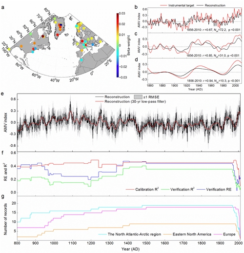 基于46条气候代用资料重建的北大西洋多年代际变率序列。(a)代用资料的空间分布及其在重建模型中的贡献权重;(b-d)北大西洋多年代际变率重建序列和仪器记录序列在年际(b)、年代际(c)和多年代际(d)尺度上的比较;(e)过去1200年北大西洋多年代际变率的重建序列及其误差范围;(f)重建模型在校准和验证时段的相关参数统计;(g)重建模型用到北大西洋周边(北极、北美东部和欧洲)地区代用资料的数量。