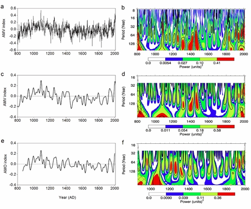北大西洋多年代际变率及其气候系统的内部贡献部分(北大西洋多年代际涛动)的时间序列及其对应的小波功率谱。(a,b)重建的年分辨率的北大西洋多年代际变率(a)及其小波功率谱(b);(c,d)北大西洋多年代际变率30年低通滤波曲线(c)及其小波功率谱(d);(e,f)扣除气候外强迫的贡献后估算的气候系统对北大西洋多年代际变率的内部贡献部分(即北大西洋多年代际涛动)(e)及其小波功率谱(f)。