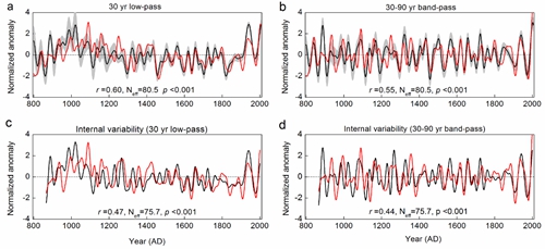 过去1200年北大西洋多年代际变率(红线)与北半球温度(黑线)的比较。(a,b)北大西洋多年代际变率和北半球平均温度在>30年(a)和30-90年时间尺度上的比较(b);(c,d)扣除气候外强迫贡献后估算的北大西洋多年代际变率和北半球温度各自的内部贡献部分在>30年(c)和30-90年时间尺度上的比较(d)。