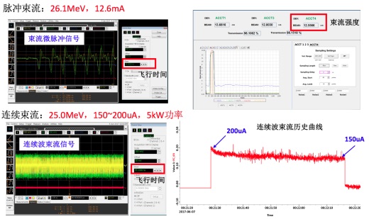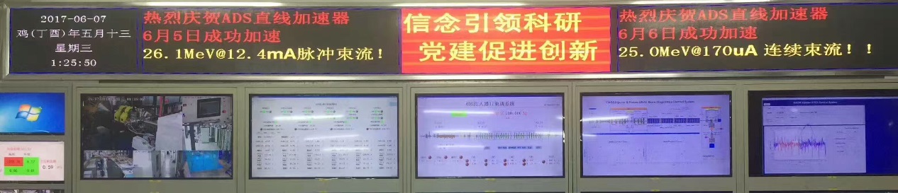 测试专家组听取了近代物理所研究员何源关于“ADS超导直线加速器研制报告和现场测试大纲”的报告,审议了测试方案,亲自记录了加速器的测试运行指标。专家组于6月5日对脉冲束流指标进行了现场测试,测试结果为质子束能量26.1MeV、脉冲流强12.6mA;6日继续对连续束流指标进行了现场测试,测试结果为质子束能量≥25.0MeV、连续束流强150-200μA。由于辐射剂量限制,连续波束流在稳定运行1分钟后主动停止了测试运行。ADS超导质子直线加速器现场测试结果达到了ADS先导专项中束流能量25MeV的既定指标要求,脉冲流强超过了设计值10mA。此次测试达标,在国际上第一次实现了能量25MeV的超导质子直线加速器连续波束流,为后续近代物理所承担的国家重大科学基础设施——加速器驱动嬗变研究装置(CiADS)的建设打下了坚实基础。