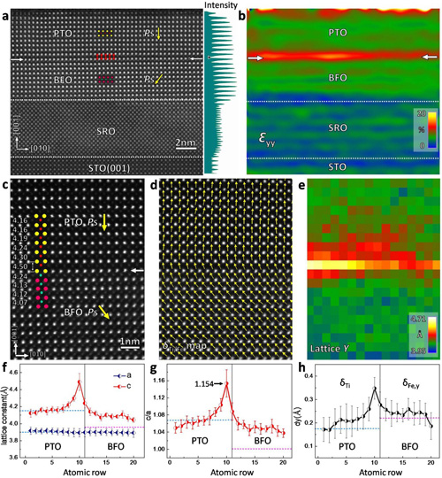 图1. BiFeO3/PbTiO3薄膜界面处的晶格参数,应变和离子位移分析。在BiFeO3/PbTiO3界面附近,不仅面外晶格参数(c)显著拉长,Ti和Fe沿面外方向的离子位移(δTi,δFe)也显著增大,预示界面附近PbTiO3中铁电极化显著增大。