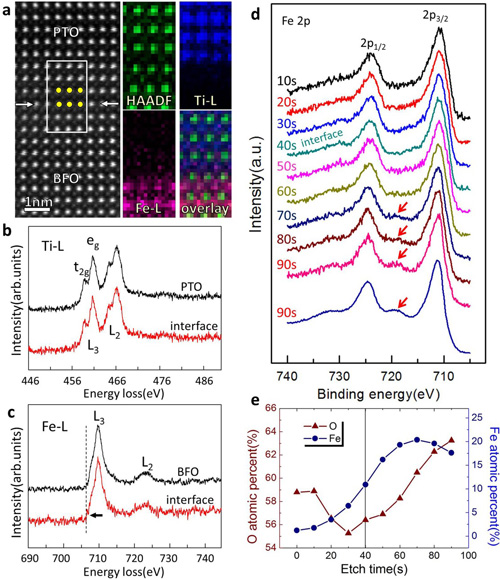 图3. BiFeO3/PbTiO3界面的电子能量损失谱(a-c)和X射线光电子谱(d-e)分析表明,在BiFeO3/PbTiO3界面处存在氧空位聚集以及Fe3+向Fe2+的转化。