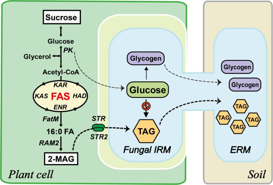 王二涛团队通过稳定同位素标定实验,首次否定了糖是植物传递给菌根真菌的主要碳源形式。同时,研究者采用遗传学、分子生物学及代谢生物学的手段研究发现,植物宿主的脂肪酸合成对于丛枝菌根真菌共生是必须的,并且植物合成的脂肪酸能够直接传递给菌根真菌。进一步的研究发现植物基因合成的一类特殊脂肪酸分子,被植物的转运蛋白转运给菌根真菌。该研究系统揭示了脂肪酸是光合作用碳源的主要传递形式,推翻了传统认识,对于理解生态系统的碳氮循环具有重要的意义。