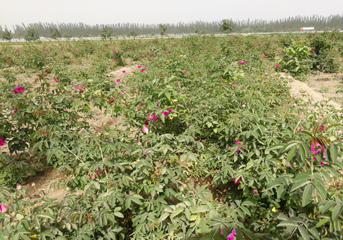 2016年采用3种栽培模式栽植了20亩和田玫瑰;在种植的第一年套种了车前草、香青兰、驱虫斑鸠菊、毛菊苣等一年生维药材,收获了一季维药材。为了保证药材的质量安全,科研人员在墨玉农业园区和田玫瑰标准化试验示范区一直施用腐熟的农家肥、生物有机肥,不施用化肥,田间杂草采用传统的人工除草方法。于2017年5月3日开了第一朵玫瑰花,经科研人员田间观测,和田玫瑰的开花特点为五月上旬始花期,五月中下旬盛花期,六月初开花末期。2017年3月栽植的和田玫瑰,现有个别也开花了。6月9日,科研人员完成了近期的人工除草、浇水等药材种植标准化管理工作。截至6月14日,两年生和田玫瑰苗已经采收玫瑰花60公斤、玫瑰花蕾45公斤(鲜重),将为新疆理化所药物研发中心提供第一批自产的绿色有机玫瑰原料。