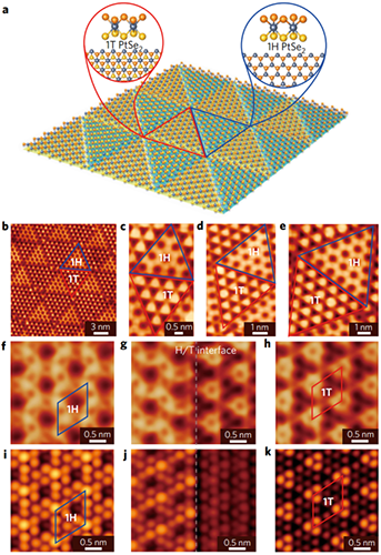 图1 1H/1T图案化的单层PtSe2薄膜。a:三角形图案化的1T/1H-PtSe2示意图。b:1H/1T-PtSe2薄膜的STM图像。c-e:不同尺寸1H/1T-PtSe2畴的STM图像。f-h:1H-PtSe2畴(f)、1H-PtSe2和1T-PtSe2界面(g),以及1T-PtSe2畴(h)的高分辨STM图像。i-k:1H-PtSe2畴(i)、1H-PtSe2和1T-PtSe2界面(j)和1T-PtSe2畴(k)的STM模拟图像。