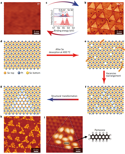 图2 1H/1T-PtSe2薄膜的可逆转变和分子选择性吸附。a,b:1T-PtSe2 (a)和1H/1T-PtSe2 (b)的STM图像。c:可逆转变过程的XPS谱线。d-g:从1T-PtSe2到1H/1T-PtSe2转变的示意图。h:并五苯分子选择性吸附在1H-PtSe2畴的STM图像。i:并五苯选择性吸附的高分辨STM图像。