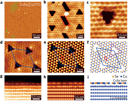 图3 具有周期性孔洞图案的单层CuSe结构。a:大面积图案化单层CuSe的STM图像,图中绿色格子表示周期为3nm的孔洞结构。b:单层CuSe畴边界的STM图像。c:单个三角形孔洞的高分辨STM图像。d-f:具有周期性孔洞结构CuSe薄膜的高分辨STM图像(d)、STM理论模拟图像(e)和相应的理论模型(f)。g-i:单层CuSe薄膜横截面的STEM图像(g)、模拟的STEM图像(h)和相应的结构图(i)。