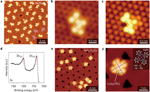 图4 周期性孔洞CuSe薄膜的功能化特性。a:三角形孔洞嵌有W形Fe13Se7团簇的单层CuSe薄膜的STM图像。b:单个W形团簇的高分辨STM图像。c:单个W形团簇STM模拟图像。d:Fe13Se7/CuSe中Fe元素的XPS谱线。e:FePc分子选择吸附在CuSe薄膜上的STM图像。f:单个FePc分子吸附在CuSe表面的高分辨STM图像。
