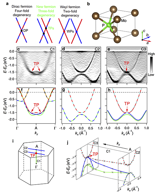 图2:(a)四重、三重和两重简并点的能带示意图,在这些简并点附近的准粒子分别是狄拉克费米子、三重简并的新费米子和外尔费米子。红色或蓝色的直线代表非简并的能带,红蓝交替的直线代表两重简并的能带。(b)MoP的晶体结构。(c-e)实验测量的布里渊区三个方向C1、C2、C3的能带色散。(f-h)相应的能带计算结果。(i)C1、C2、C3在布里渊区中的位置,其中C1和C3穿过三重简并点(红色圆点)。(j)从实验中提取出的能带色散构成的三维图。