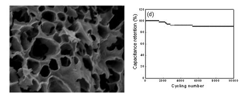 进一步利用生物质柳絮天然通道作模板,通过调控碳化和活化条件,制成了管状、多孔、大比表面积炭材料。以此多孔炭电极构建的有机系超级电容器显示出高比容量与长寿命的特点。研究成果以封面的形式发表于J. Mater. Chem. A, 2016, 4, 1637-1646。