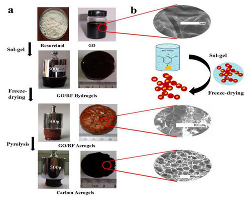 针对目前由于水分移除产生的毛细管作用力会引起孔收缩甚至坍塌,导致碳气凝胶的比表面积较低的问题,研究人员将氧化石墨烯添加到酚醛树脂中,利用氧化石墨烯作为模板剂和增强剂的特性来调控碳气凝胶的孔结构,经一步碳化法获得了超高比表面积(2728 m2•g-1)的碳气凝胶。所得的碳气凝胶有望用作超级电容器电极材料以及Li电池和Na电池的负极材料。相关工作以快讯(Communication)形式发表于Microporous and Mesoporous Materials, 2016 , 240 :145-148。