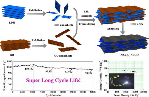 为进一步拓展水系超级电容器的工作电压,课题组与700组研究人员将带有相反电荷的钴镍双金属氢氧化物和氧化石墨烯纳米片通过静电作用,进行可控的层层组装,并经后续热处理,制得具有层状结构的NiCo2O4/石墨烯复合材料,并构建了稳定工作电压达1.5V的NiCo2O4/石墨烯复合材料//活性炭非对称超级电容器体系。其展示了优异的循环性能以及高的能量密度。相关文章发表于Energy Storage Materials (DOI: 10.1002/advs.201600408)。