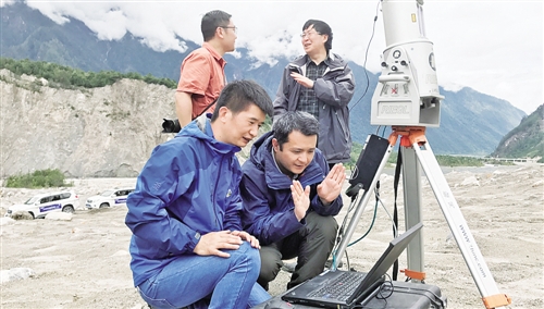 中科院成都山地所科研人员正在使用3D激光扫描仪对易贡滑坡灾害链地区提取高分辨地形地貌信息。佘惠敏摄