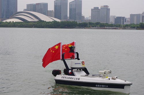 7月3日下午,合肥市公安局巢湖水上分局在天鹅湖举行“无人智能巡逻艇”首巡仪式。
