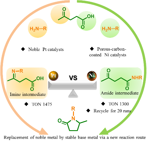 乙酰丙酸有两个官能团(羰基和羧基)能与胺类化合物反应,分别生成相应的亚胺和酰胺。基于贵金属铂和非贵金属镍催化剂在亚胺加氢反应中的活性差别(经过实验和理论计算验证),李福伟团队发展了一条镍催化乙酰丙酸液相还原胺化制备吡咯烷酮的新路径。经过中间体分离表征和原位实验研究,发现在该反应中首先形成酰胺中间体,随后发生环化、分子内脱水、加氢得到吡咯烷酮(图右),这完全不同于以往报道的贵金属催化反应体系中经由亚胺中间体的反应路径(图左)。此外,他们与中科院山西煤炭化学研究所研究员覃勇课题组合作,利用原子层沉积技术所制备的多孔碳包覆的Ni NPs催化剂上厚度适中的多孔碳壳可有效防止Ni NPs的流失和团聚,并且不影响反应活性,催化剂在循环利用20次过程中未发现金属纳米粒子的流失和团聚。该研究为通过调控反应路径发展非贵金属催化剂以及提高多相催化剂在液相反应中的稳定性提供了新的研究思路。该研究结果近期发表于ACS Catalysis, 2017, 7, 4927-4935。