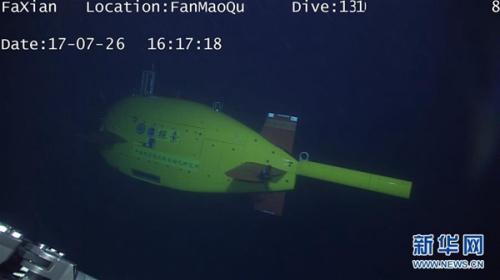 缆控式遥控无人潜水器“发现”号拍摄的自治式水下机器人“探索”号视频截图(7月26日摄)。新华社发