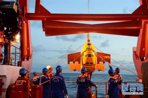 7月26日,自治式水下机器人“探索”号与缆控式遥控无人潜水器“发现”号完成协同作业,被回收至母船。新华社记者 张旭东 摄