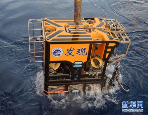 7月26日,缆控式遥控无人潜水器“发现”号与自治式水下机器人“探索”号完成协同作业,被母船吊出水面。新华社记者 张旭东 摄