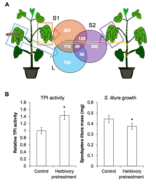 A. 斜纹夜蛾取食L叶片后诱导的S1(被取食大豆的系统性叶片)和S2(菟丝子连接的未被取食的大豆叶片)转录组中受到调控的基因的维恩分析图。B. S2叶片中抗虫物质TPI的活性变化。C. 处理组和对照组中S2叶片的抗虫性分析。