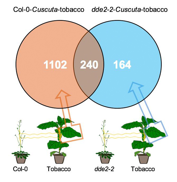 将拟南芥野生型(Col-0)或者茉莉酸合成缺陷突变体dde2-2和栽培烟草通过菟丝子进行连接后,发现茉莉酸是重要的抗虫系统性信号的重要调控因子。