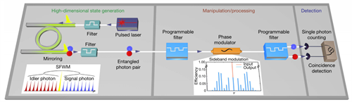 近期,在中国科学院战略性先导科技B专项“大规模光子集成芯片”支持下,中科院西安光学精密机械研究所与国外多家科研机构合作,在高维纠缠量子集成芯片研究方面取得重大突破。基于微谐振腔中多个高纯度频率模式相干叠加的独特方案,解决了片上高维纠缠双光子态制备与控制的国际难题,证实了利用10级纠缠双光子态实现超100维的片上量子系统,为目前芯片上国际最高水平。并通过频率操控实现了对量子态的灵活控制。与传统二维量子系统相比,高维量子纠缠芯片能够完成更高性能的量子通信与计算等任务,极大提升量子通信协议鲁棒性和速率,并有望将未来高维量子计算系统的复杂程度降低到可接受范围。相关成果于6月发表在《自然》(Nature)上。