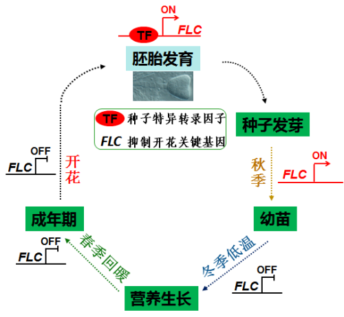 春化作用是指某些植物必须经历一段时间的持续低温,才能由营养生长阶段转入生殖阶段生长的现象。植物如何响应并记忆长时间的低温处理即春化作用,是表观遗传学和发育生物学的研究热点。解析植物如何响应冬季低温,并在春季气温上升后能“记住”其冬季低温经历、以适时开花的分子机制,具有理论和实际应用价值。这可确保植物在破坏性的冬季避免开花,而在温暖的春季开花结实。该机制的解析与作物栽培、引种驯化、杂交育种等密切相关。