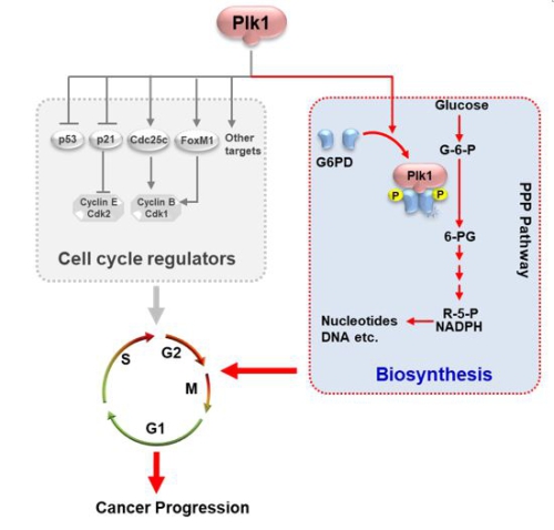肿瘤代谢重编程和细胞周期调控异常是肿瘤的两个重要特征,然而人们尚不清楚这两者之间如何相互协调以促进肿瘤细胞的增殖和肿瘤的发生发展。课题组首次发现在肿瘤细胞中,重要的周期调控蛋白Plk1在周期进程中调节磷酸戊糖途径的关键代谢酶G6PD的活性,并进而促进生物大分子合成以及肿瘤细胞在体内外的增殖。进一步的机制研究发现,Plk1通过结合并磷酸化修饰G6PD,使G6PD形成二聚体增多,从而促进酶活性以及整个磷酸戊糖途径。增强的磷酸戊糖途径对于肿瘤细胞的周期进程以及肿瘤的发生发展有重要的促进作用。该研究首次发现了周期调控蛋白Plk1在调节生物大分子合成方面的新功能,揭示了代谢重编程与周期调控相互协调共同促进肿瘤细胞快速增殖的新机制,对临床肿瘤的靶向治疗有潜在的指导意义。
